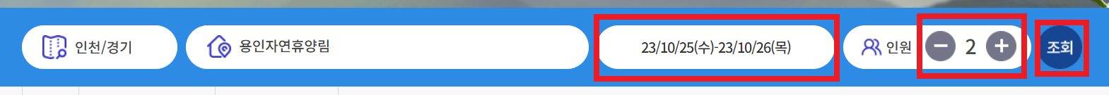1. 예약시스템(용인 산림치유원 예약사이트)에 접속하여 방문하려는 날짜와 인원수를 입력 후 조회를 누릅니다